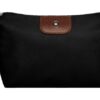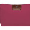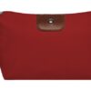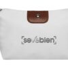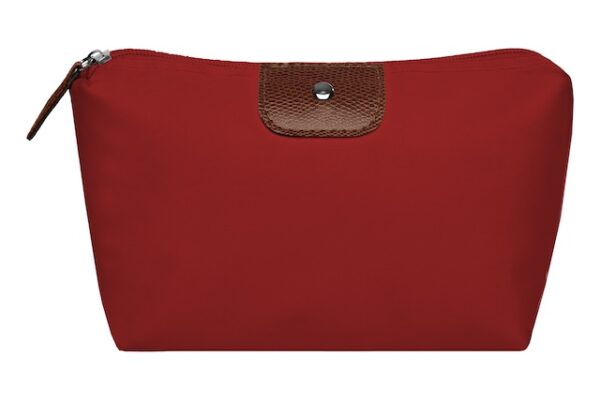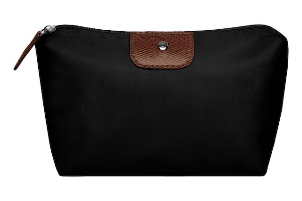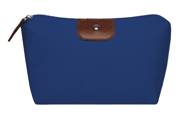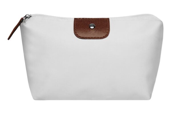 22 x 13 x 5,5 cm. Polyester. Necessaire con detalles en símil cuero y un botón metálico en el frente. Interior con forro. Tiradores de cierre de símil cuero.