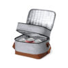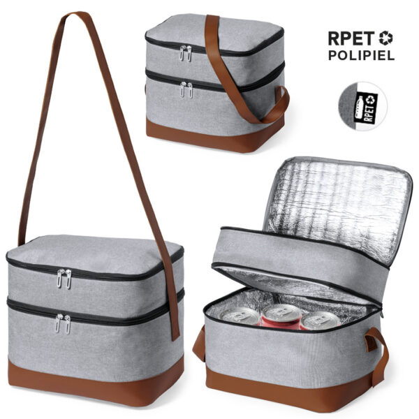 Nevera fabricada en resistente 600D RPET. Acabado en color gris, con base y cinta bandolera de transporte en polipiel marrón. Incluye 2 compartimentos independientes, con cierre de cremallera y tiradores metálicos. Interior isotermo en aluminio y etiqueta exterior con distintivo RPET. El material RPET se elabora a partir de plástico reciclado, para así fomentar la reutilización de residuos plásticos y ayudar a la sostenibilidad del planeta.