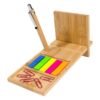 19,5 x 8,5 x 0,7 cm. y 10 x 8,5 x 0,7 cm. Bambú. Organizador de escritorio compuesto por dos piezas encastrables con compartimentos para accesorios y ranuras porta boligrafo y porta celular. Parte posterior también funciona como soporte porta celular. Incluye bolígrafo (cuerpo de bambú, pulsador, clip y detalles metálicos, tinta negra), set de 5 señaladores autoadhesivos de diferentes colores y clips en color rojo. Ideal para acompañar tus tareas tanto en la oficina como home office. PRESENTADO EN CAJA DE REGALO.