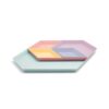 2 módulos de 19 x 11 cm, 1 módulo de 29 x 22 cm, 1 módulo de 33 x 19 cm y 1 módulo de 38 x 33 cm. Plástico. Organizador de escritorio con 5 bandejas modulables de distintos tamaños y colores.
