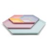 2 módulos de 19 x 11 cm, 1 módulo de 29 x 22 cm, 1 módulo de 33 x 19 cm, 1 módulo de 38 x 33 cm y 1 módulo de 44,5 x 38,5 cm. Plástico. Organizador de escritorio con 6 bandejas modulables de distintos tamaños y colores.