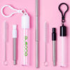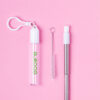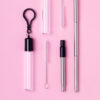Pajita reutilizable y extensible en acero inoxidable, con boquilla de silicona. Con accesorio limpiador incluido y presentada en estuche transparente con accesorio para transporte. Extensible. Reutilizable. Limpiador Incluido
