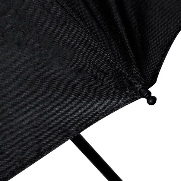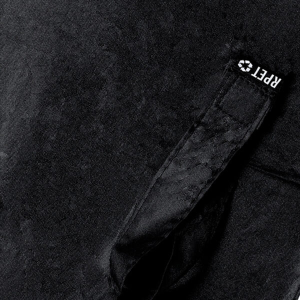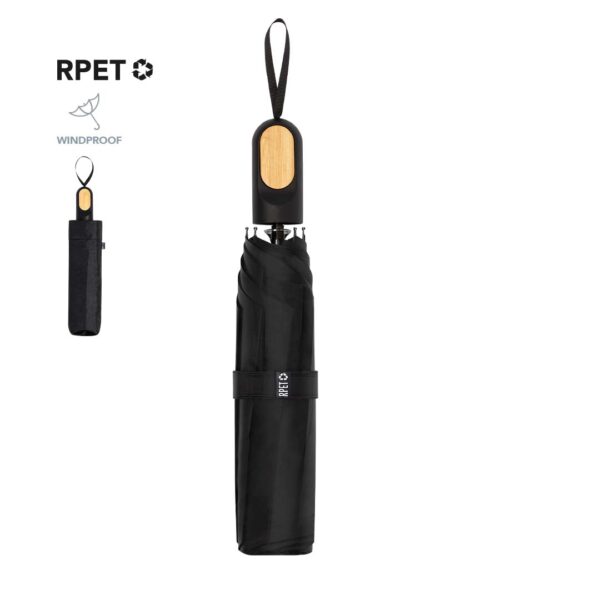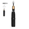 Paraguas plegable de 97cm de diámetro. En material pongee 190T RPET. De apertura manual, con sistema anti viento y varillas fabricadas en fibra de vidrio. Mango ergonómico con elegante detalle en bambú, fácil transporte gracias a su cordón, funda y cierre con velcro a juego. Con etiqueta distintiva RPET. Presentado en bolsa individual reciclada. El material RPET se elabora a partir de plástico reciclado, para así fomentar la reutilización de residuos plásticos y ayudar a la sostenibilidad del planeta. 21″. Sistema Antiviento. Funda Pongee RPET
