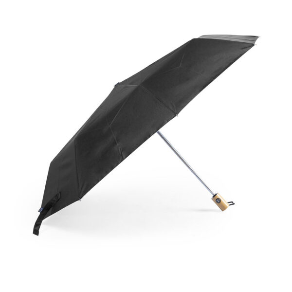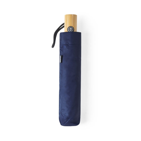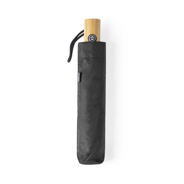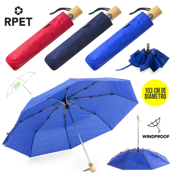Paraguas plegable de línea nature de 103cm de diámetro. En material pongee 190T RPET, elaborado a partir de plástico reciclado, para así fomentar la reutilización de residuos plásticos y ayudar a la sostenibilidad del planeta. De apertura y cierre automáticos, con mecanismo anti viento y varillas de fibra de vidrio. Mango de bambú con botón, distintivo RPET en etiqueta y disponible en variada gama de colores. Funda RPET a juego incluida. 23″”. Apertura y Cierre Automático. Sistema Antiviento. Mango Bambú. Funda Pongee RPET