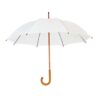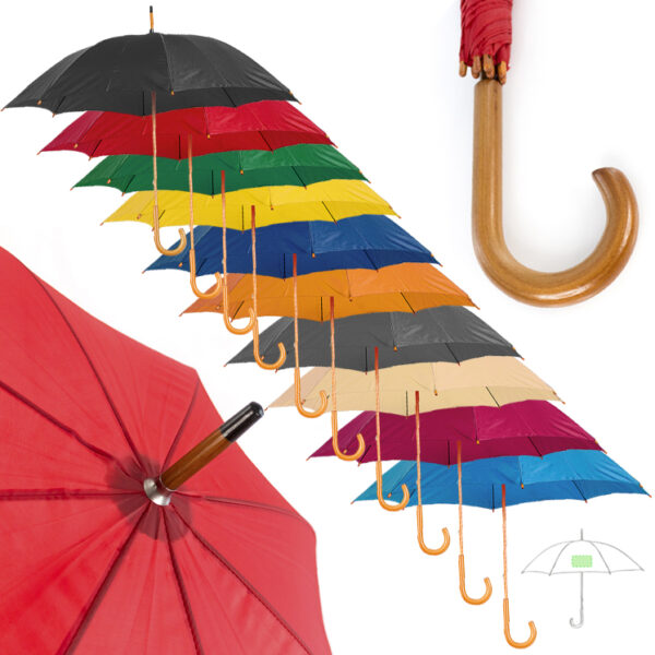 Paraguas de 8 paneles en variada gama de vivos colores. De 105cm de diámetro, con apertura manual y en resistente material poliéster. Con varillas metálicas en color negro, cierre de velcro y suave mango de madera en color natural. 23″”. Mango y Caña Madera