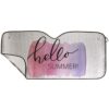 Parasol en aluminio con burbuja en ambas caras en color plateado de acabado metalizado con ribetes en color negro. De tamaño 130x60cm, con argollas metálicas de refuerzo, cintas elásticas para plegado, dos ventosas para ajuste en luna y presentación desplegado en plancha para fácil impresión.