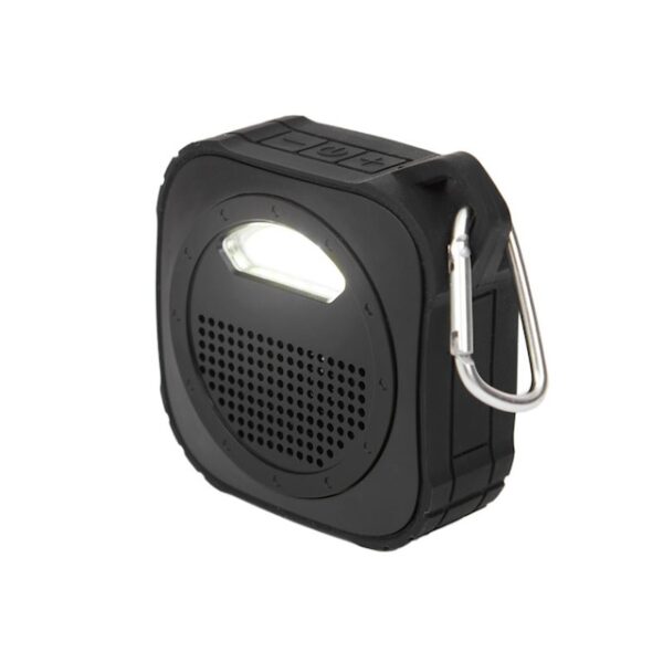 Parlante Bluetooth, con luz de 5V. Cuenta con gancho para transportarlo. Está realizado en ABS y silicona. Batería: 600mah. Medidas: 9 x 9 x 3,3 cm.