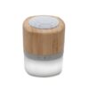 Parlante portátil con tecnología Bluetooth. Realizado en combinación de ABS con Silicona y bamboo, con iluminación en la base. Características técnicas: Batería de 300mAh | Poder del parlante: 3W | Frecuencia: 200Hz-20KHz | Conexión: 5V / 500mA | Distancia de alcance: 10 Metros | Peso 150gr | Medidas: 6 x 6 x 7,5 cm. ReUseMe. Incluye Gift Box confeccionada en cartulina Kraft.