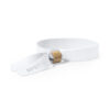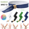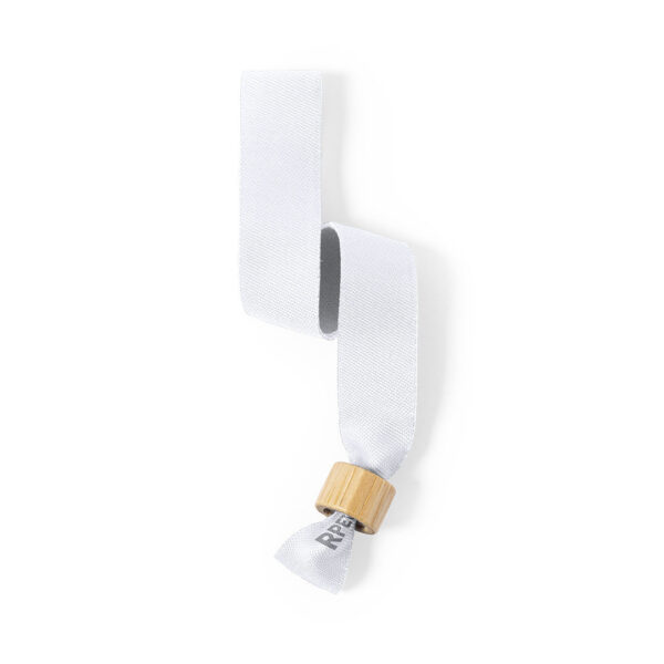 Pulsera para eventos de línea nature. Fabricada en poliéster RPET de 160g/m2, elaborado a partir de plástico reciclado para así fomentar la reutilización de residuos plásticos y contribuir a la sostenibilidad del planeta. Con ajustador en bambú y disponible en variada gama de colores, color blanco especialmente diseñado para sublimación. Distintivo RPET impreso en la pulsera. Ajustable. Cierre Seguridad