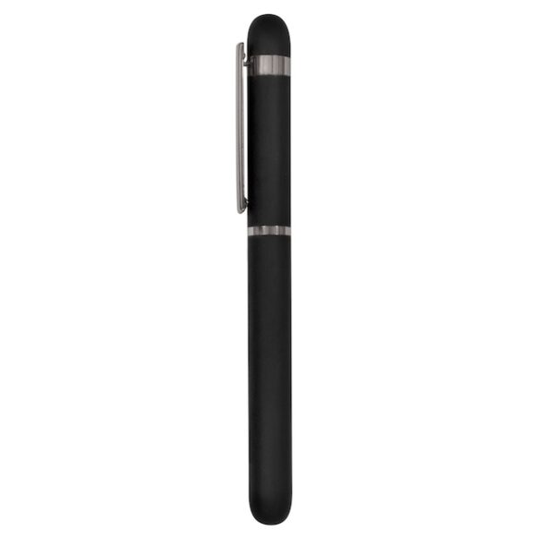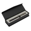 NovedadesMetal. Cuerpo de aluminio. Roller. Apertura con tapa a presión. Clip y anillos metálicos color plata. Tinta Negra. Decapa color plata tanto en el cuerpo como en la tapa. Presentación en estuche con cierre magnético.