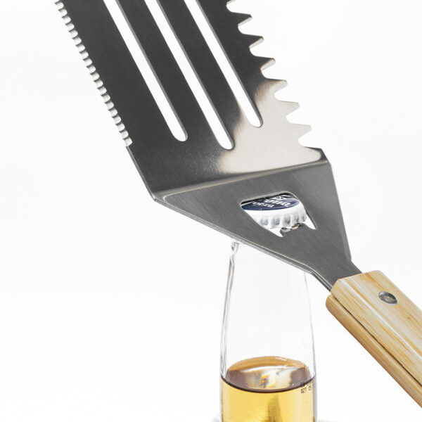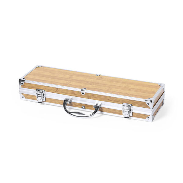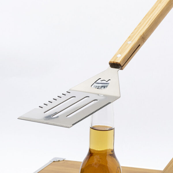 Set de barbacoa de línea nature y 3 accesorios fabricados en metal con mango de bambú. Incluye paleta con abridor, trinchador y pinzas. Presentado en estuche imitación bambú, con terminaciones en metal. Presentado en atractiva caja individual de diseño eco. 3 Accesorios