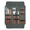 NovedadesØ 9 x 46 cm. (cerrado) 60 x 46 cm. (abierto). Poliester y acero inoxidable. Set para asador cuenta con tenedor asador, cuchilla de acero inoxidable, cepillo de aluminio, espátula, pinza, pincel, 4 pinchos para brochetas y 6 pinchos pequeños. Estuche de polyester con manilla y tres hebillas plásticas para cerrar.