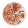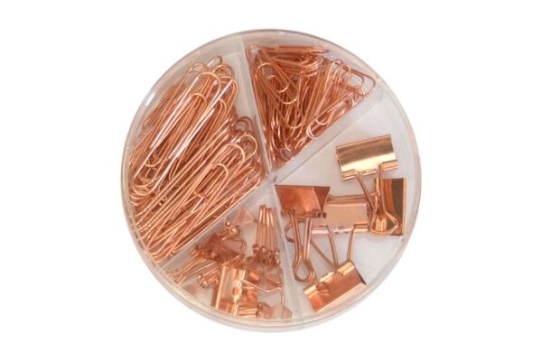 NovedadesØ 10 x 2,6 cm. Plástico. Set de clip y sujeta papeles color cobre en estuche con 4 divisiones. 5 sujeta papeles de 1,9 cm. 8 sujeta papeles 1,5 cm. 30 clip 5 cm. 70 clip 2,8 cm. Estuche contenedor con cuatro divisiones. Presentación en caja de regalo.