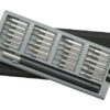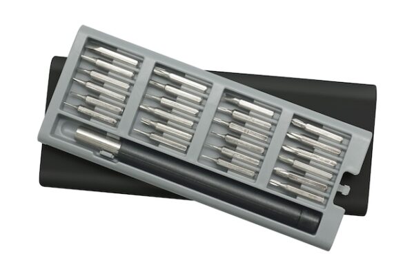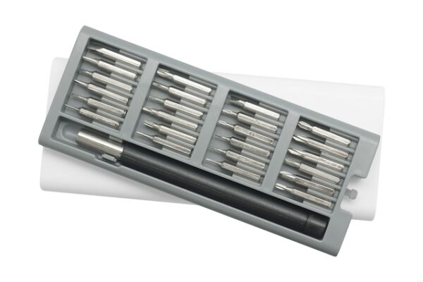 16,5 x 6,8 x 1,8 cm. Plástico y Acero. Mango con punta imantada con 24 puntas diferentes. La caja viene con cuatro compartimentos imantados que permiten mantener ordenadas las diferentes puntas. La caja contiene apertura push.