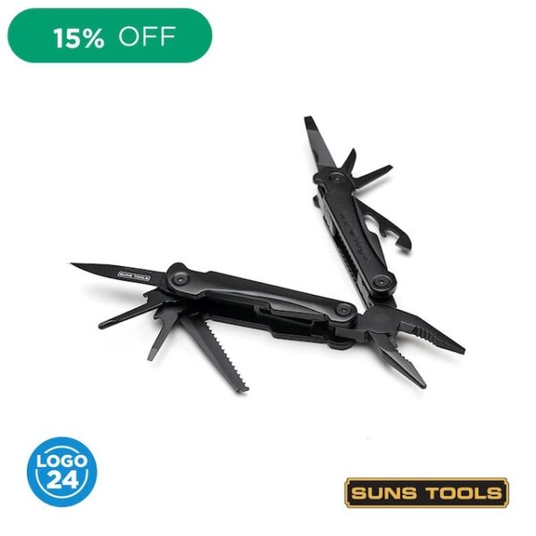 Multi Herramienta de acero inoxidable y aluminio con 13 funciones. Incluye funda negra. Medidas Multitool: 2.2 x 4.5 x 10.5 cm. Medidas Packaging: 4.3 x 14.3 x 15.5 cm. Suns Tools. LOGO24: Producto disponible para el servicio de logueo en 24 horas respetando unidades mínimas de logueo y 200 unidades máximas. Consultar términos y condiciones del servicio.