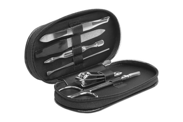 11 x 5 x 2 cm. (cerrado) 11 x 12,5 x 1,1 cm. (abierto). Set de manicura. Metal y simil cuero. Estuche organizador con cierre que contiene: tijera, alicate, 2 limpia cutículas, lima metálica y pinza de depilar.