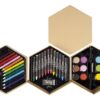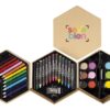 16 x 8 cm. (cerrado) 44 x 8 cm. (abierto). Cartón. Set de pinturas en forma de hexágono. 12 lapices de colores, 1 sacapuntas, 12 crayones, 1 goma de borrar, 12 acuarelas y 1 pincel.