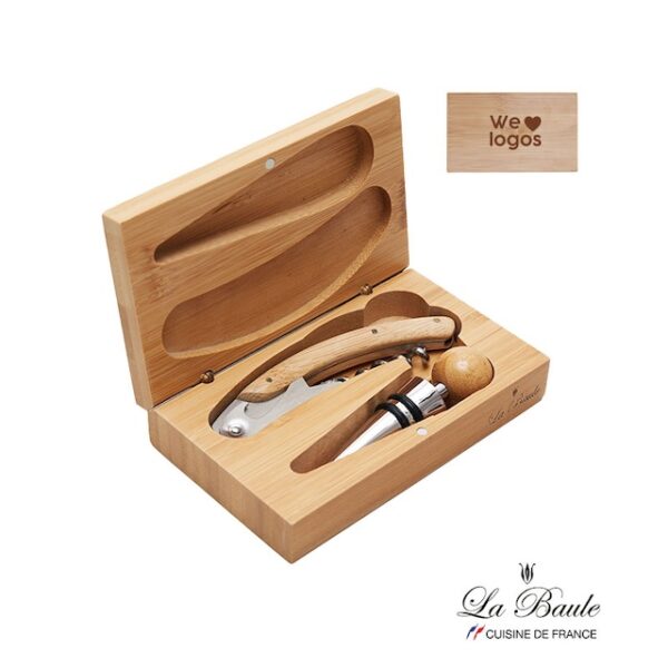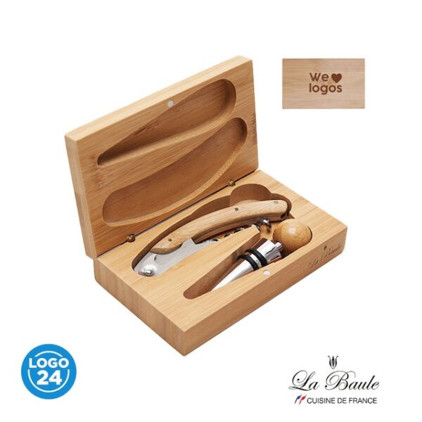Set de vinos en caja de bamboo de dos elementos. Posee: Sacacorchos dos tiempos y tapón, realizado en acero inoxidable. Medidas de la caja: 13 x 8 x 3,2 cm. La Baule. LOGO24: Producto disponible para el servicio de logueo en 24 horas respetando unidades mínimas de logueo y 200 unidades máximas. Consultar términos y condiciones del servicio