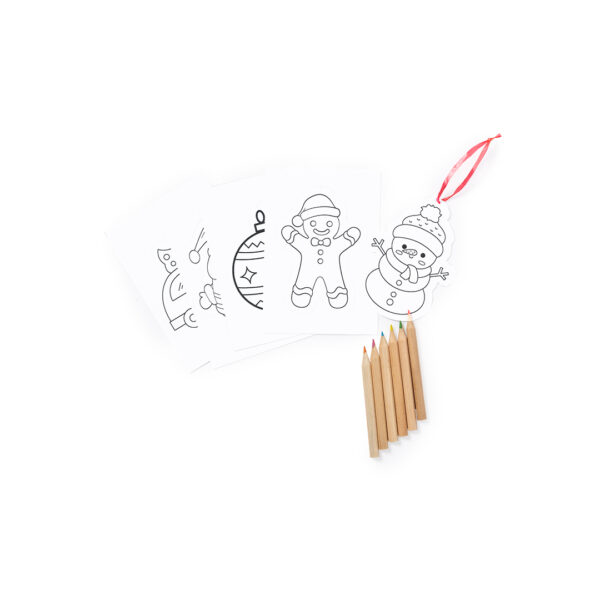 Set de adornos con 6 originales diseños navideños para colorear y decorar el árbol de navidad. Incluye 6 lápices de madera en diferentes colores. Fabricados en cartón y presentados en una bolsa reciclada. 6 Lápices y 6 Adornos Incluidos