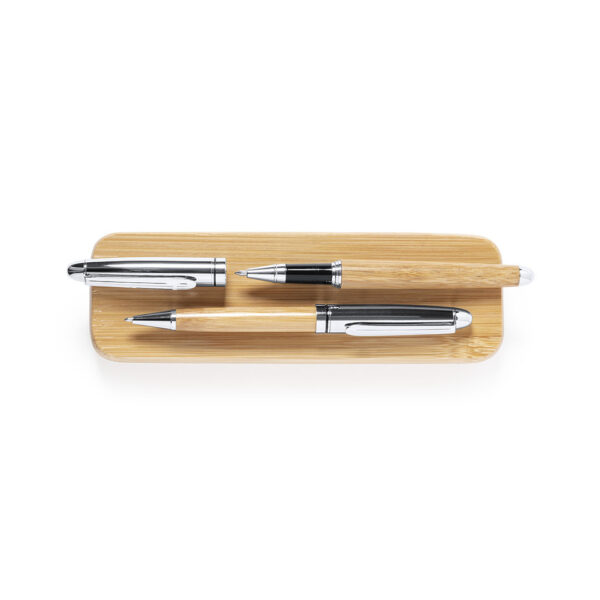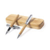Set de bolígrafo y roller de línea nature. Fabricado en combinación de bambú con metal, para así fomentar la utilización de materias primas naturales y reducir las emisiones contaminantes. Bolígrafo de mecanismo giratorio en tinta azul. Roller con capucha, tinta gel en azul y carga jumbo. Presentado en estuche individual de bambú. Bolígrafo y Roller. Carga Jumbo