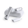 Set de batería auxiliar externa de 2.200 mAh de capacidad de carga, cargador de coche con salida de carga dual USB de 2.100 mA y cargador de pared de 1.000 mA. En resistente aluminio de acabado metalizado, con accesorio rompe cristales en cargador para el coche presentados en resistente y elegante estuche de polipiel en color blanco. Con cable tipo C y dual micro USB/lightning. Las capacidades mostradas en todas nuestras baterías auxiliares externas son reales, incorporando todas ellas baterías de grado A y no recicladas, con una vida útil de al menos 500 ciclos de carga y según normativa CE. Además, están fabricadas conforme a los estándares RoHS y en cumplimiento con los siguientes requisitos de seguridad: Sistema de protección contra sobrecarga del power bank. Sistema de protección contra descarga completa que proporciona una mayor durabilidad del power bank. Sistema de bloqueo para evitar cortocircuitos. Sistema de transferencia de carga constante, acorde con la capacidad del dispositivo de destino. Cargador Coche 2 Salidas USB, 2 Funciones. Cargador USB. Conexión Micro USB, Tipo C y Lightning