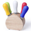 Set para quesos de 6 piezas. Con cuchilla en acero inox y mango ergonómico en variada gama de vivos colores. En base de madera natural con superficie antideslizante y presentado en atractiva caja de diseño. 5 Piezas