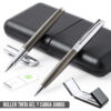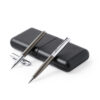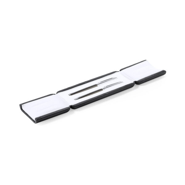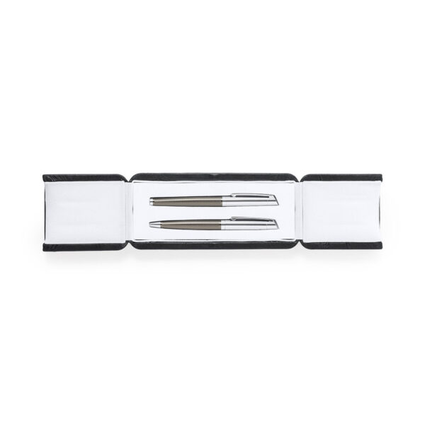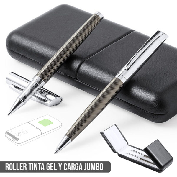 Set premium de bolígrafo y roller. Fabricado en elegante combinación de metal en tonos negros y cromados. Bolígrafo de mecanismo giratorio en tinta azul y con cartucho jumbo. Roller con capucha y tinta gel en azul, carga jumbo. Presentado en estuche individual de polipiel con interior en contraste de antelina en blanco. Bolígrafo y Roller. Carga Jumbo