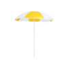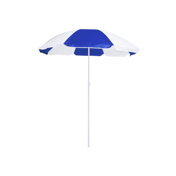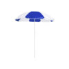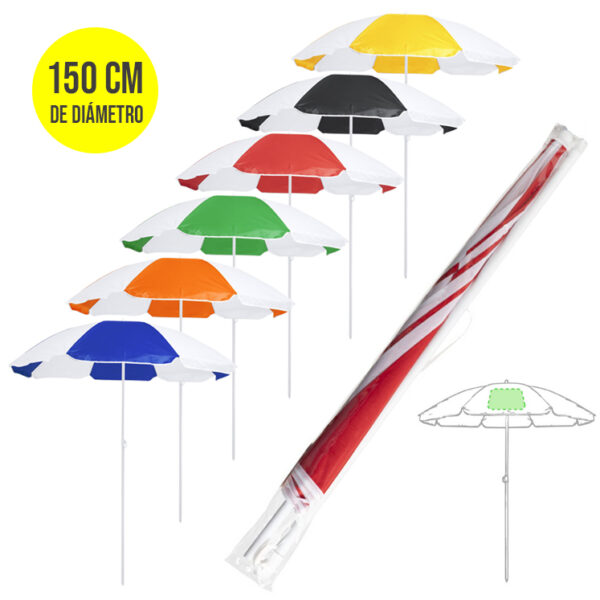 Sombrilla de playa de 8 paneles en resistente nylon de combinación bicolor. De 150cm de diámetro, con faldones laterales ribeteados, tubos metalizados en color blanco y ajustable en altura. Presentada en funda de PVC con cinta de transporte para hombro. Disponible en variada gama de colores combinados. Funda PVC
