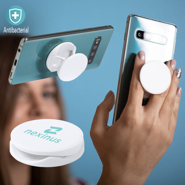 Soporte antibacteriano para smartphone. Diseño plegable en elegante acabado de color blanco, especialmente diseñado para marcaje en tampografía. Con adhesivo 3M, de fijación extra fuerte y libre de residuos al despegarlo del dispositivo. Los productos con tratamientos antibacterianos son capaces de reducir drásticamente las cargas bacterianas presentes en las superficies de los materiales, gracias a la incorporación de agentes microbianos permanentes estáticos, con alta efectividad para inhibir y prevenir la contaminación bacteriana. Artículo de acuerdo al estándar ISO 22196, que determina la actividad antibacteriana en materiales plásticos y superficies no porosas, lo que permite conocer la efectividad de inhibición microbiana que tienen los aditivos sobre los objetos tratados mediante una evaluación cuantitativa. Adhesivo
