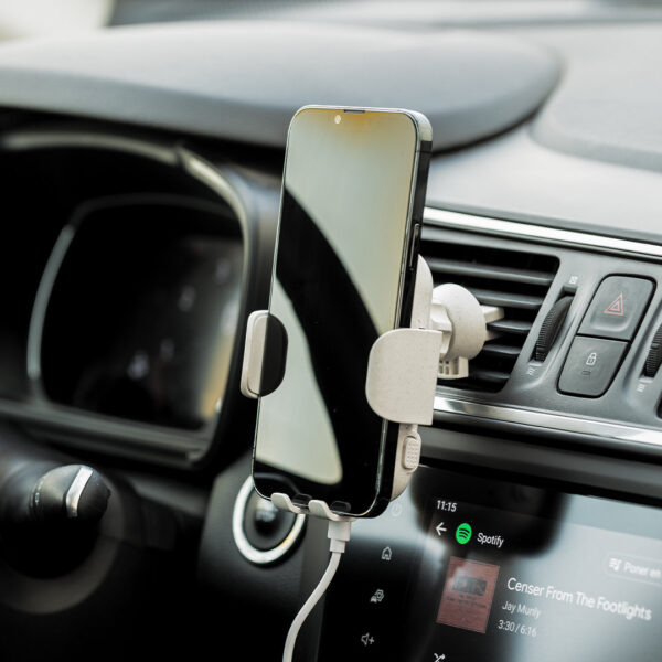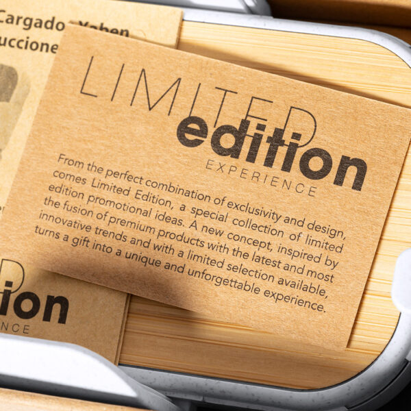 Soporte Cargador Inalámbrico de Coche Limited Edition. Un estilo innovador, donde sostenibilidad, diseño y última tecnología se combinan en una calidad premium. Fabricado en bambú y carcasa en resistente ABS y caña de trigo, para así fomentar la utilización de materias primas naturales y reducir las emisiones contaminantes . Con cargador inalámbrico de 15W y mecanismo de auto ajuste que usa el propio peso del teléfono móvil. Compatible con dispositivos móviles de carga inalámbrica, con cable cargador USB C de 100 cm y manual de instrucciones en Español e Inglés incluidos. De la perfecta combinación entre exclusividad y diseño, nace Limited Edition, una colección especial de ideas promocionales de edidición limitada. Un nuevo concepto, inspirado en la fusión de artículos premium con las últimas y más novedosas tendencias y que cuenta con una seleción limitada de unidades, convirtiendo así un regalo en una experiencia única e inolvidable. Exclusivo estuche de presentación Limited Edition,’, con diseño protegido por derechos de propiedad industrial. Incluida tarjeta con descripción de Limited Edition en cartón reciclado. Inalámbrico 15W. Ajustable
