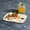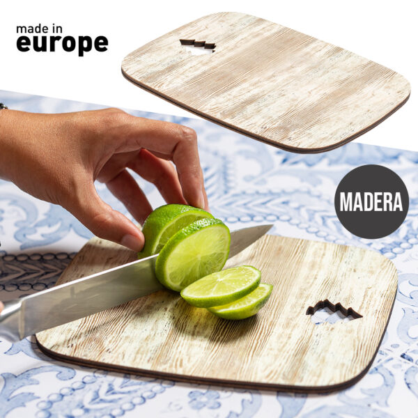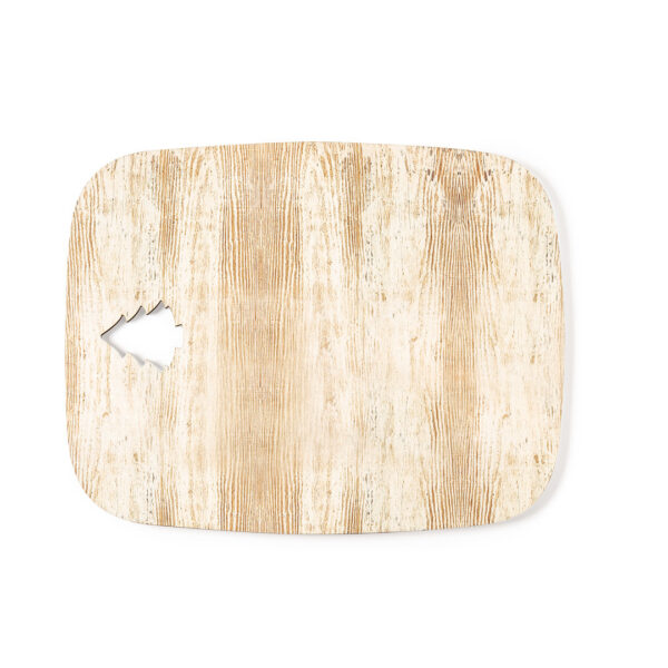 Tabla rectangular de corte y presentación con troquelado de árbol de navidad. Fabricada en madera natural y de original acabado bicolor. Amplia superficie de marcaje y distintivo Made In Europe.