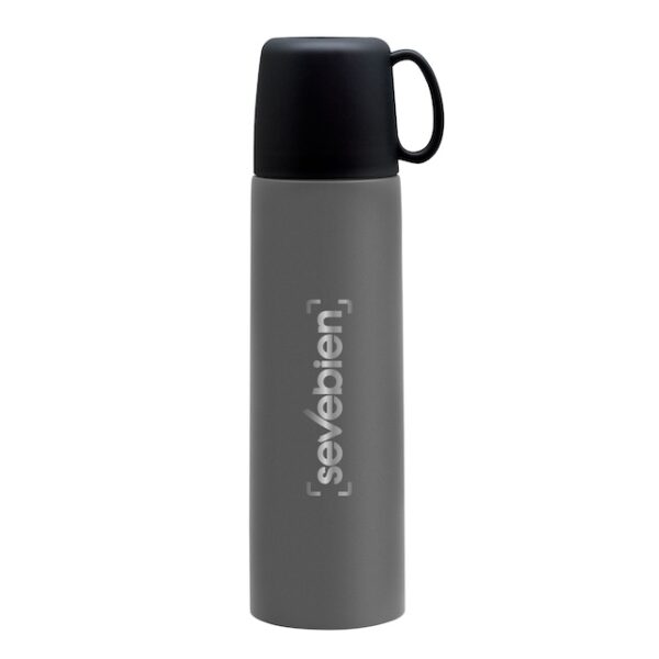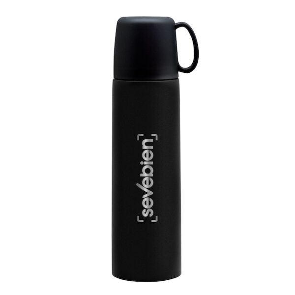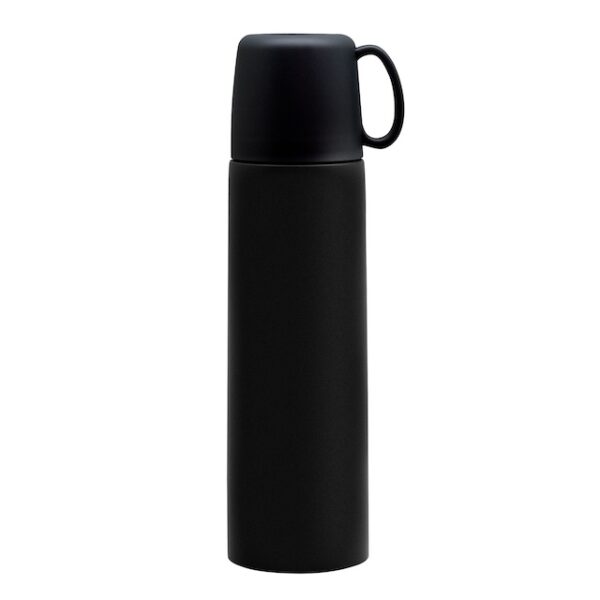 8,1 x 6,8 x 25 cm. Capacidad 500 ml. Acero inoxidable y Polipropileno. Termo con doble pared sellado al vacío. Acero inoxidable 304 interior / 201 exterior. Tapa y taza plásticas en color negro. Pintura acabado mate. Mantiene por más de 12 hs la temperatura de las bebidas calientes y 24 hs de las bebidas frías. Presentación en caja de regalo Kraft.