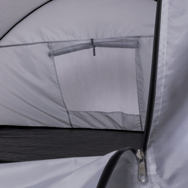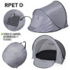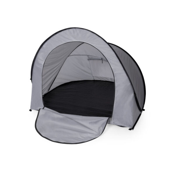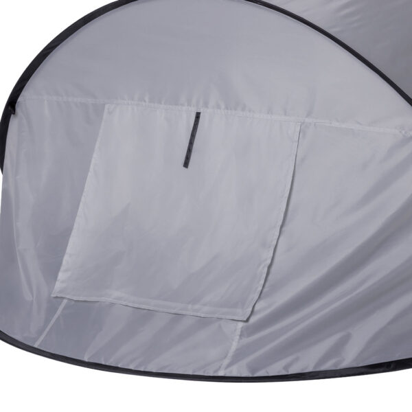 Tienda de campaña automontable, solo hay que sacarla de la funda y se despliega automáticamente. Fabricada en resistente poliéster RPET, con estructura metálica y detalles en color negro. Amplia puerta de entrada, con cierre de cremallera de doble tirador interior y exterior. Ventana en parte posterior con mosquitera, cierre de velcro y cortina enrollable con cordón y cinta de sujeción. Ideal para 2 personas y de fácil plegado. Presentada en funda a juego, con distintivo RPET en etiqueta exterior. El material RPET se elabora a partir de plástico reciclado, para así fomentar la reutilización de residuos plásticos y ayudar a la sostenibilidad del planeta. Automontable. Funda Poliéster RPET