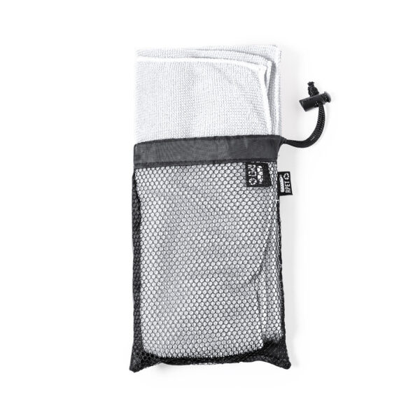 Toalla absorbente de línea nature. Fabricada en RPET de 160g/m2, elaborado a partir de plástico reciclado para así fomentar la reutilización de residuos plásticos y contribuir a la sostenibilidad del planeta. Tamaño 50×100 cm, presentada en funda individual de redecilla RPET con parte trasera lisa y disponible en variada gama de colores. Con distintivo RPET en etiqueta. Funda Poliéster RPET