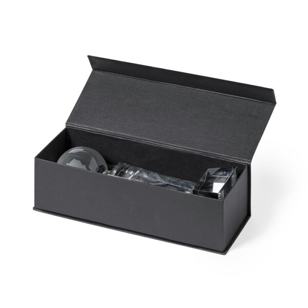 Trofeo de grueso cristal con diseño mundo y resistente base. Especialmente diseñado para marcaje a láser y presentado en estuche de protección en resistente cartón y cierre magnético, con interior troquelado en espuma.