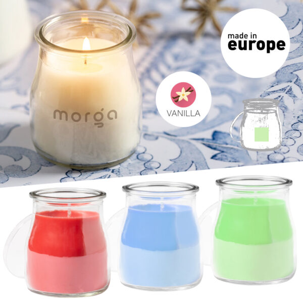 Vela aromática en tarro de cristal, disponible en aromas variados: blanco vainilla; rojo frutas del bosque; azul océano y verde musgo. Con distintivo Made In Europe.
